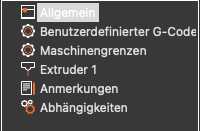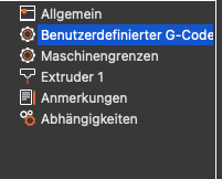 Im linken Bereich nun die Einstellungen „Benutzerdefinierter G-Code“ wählen. Hier fügen wir gleich den Code zum Farbwechsel ein.