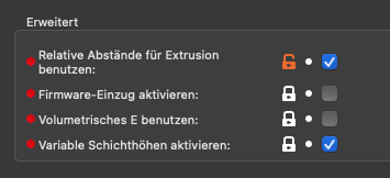 Einen Haken bei „Relative Abstände für Extrusion benutzen“ setzen. Das brauchen wir auf jeden Fall, damit die einzelnen Bahnen vom Extrusionswert nicht aufeinander aufbauen.