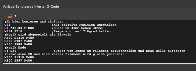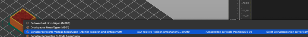 Da ist nun der G-Code zu sehen, den wir zum Farbwechsel einfügen wollen. Klickst du den an, so wird dieser an der Stelle eingefügt.