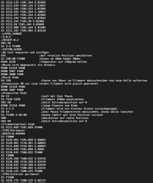 Wenn wir uns den G-Code nun anschauen, sehen wir, dass der Code an der Stelle eingefügt ist.